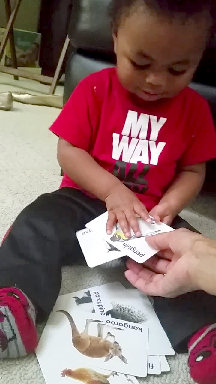 A tot boy laughs over and over when his mom shows him a flash card with a donkey on it. He does not laugh when she gives him other cards, just the donkey.