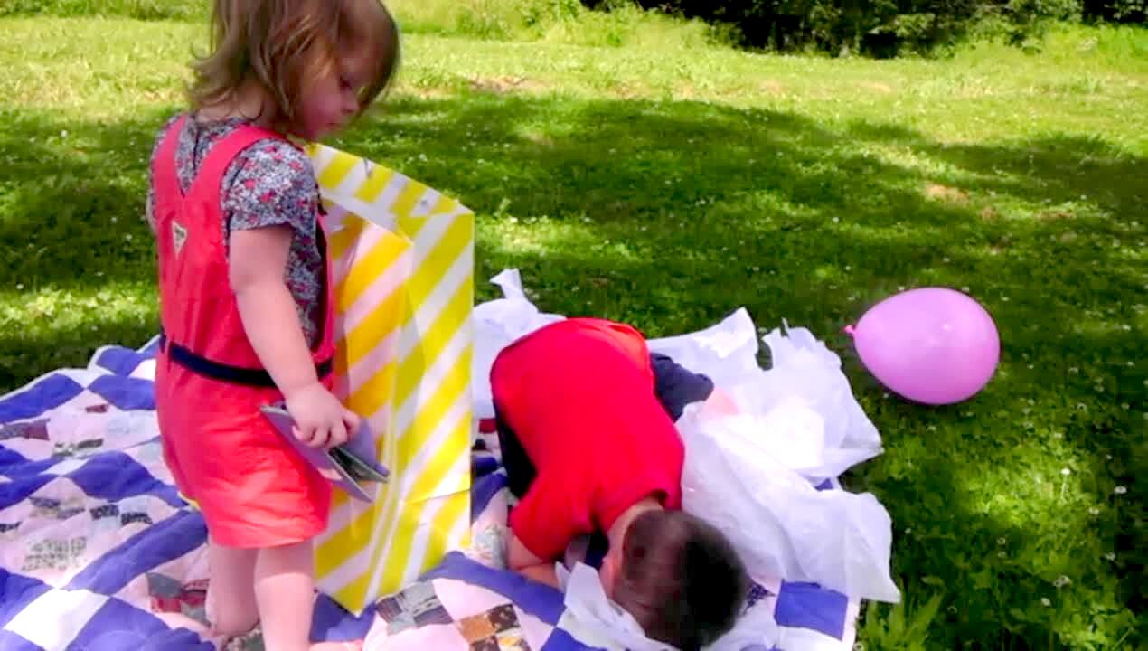 A young boy and a tot girl open a gender reveal surprise for their new sibling from a man and a woman. The boy has a meltdown outdoors because he wanted a brother.