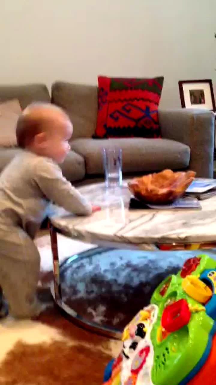 "H2O No-No" A baby boy keeps reaching for a water glass and looking back at mom every time she says "no." He gives her humorous looks.
