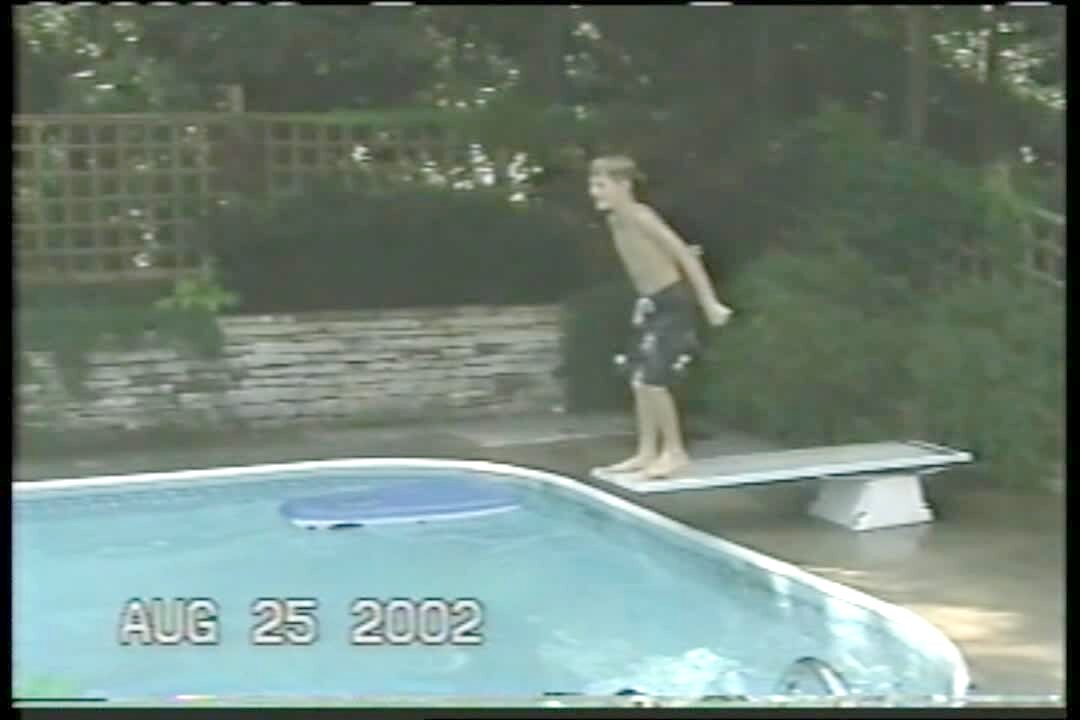 Boy stands on diving board at pool & hesitates. When he jumps, a ball flies in from off-camera & hits him in the head mid-air.