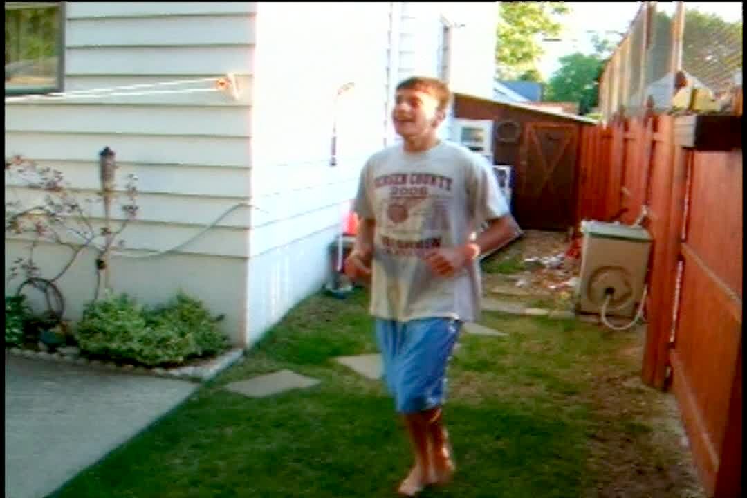A young boy hits a water balloon with a tennis racket in slow motion. AA: Super Slo-Mo Balloons.