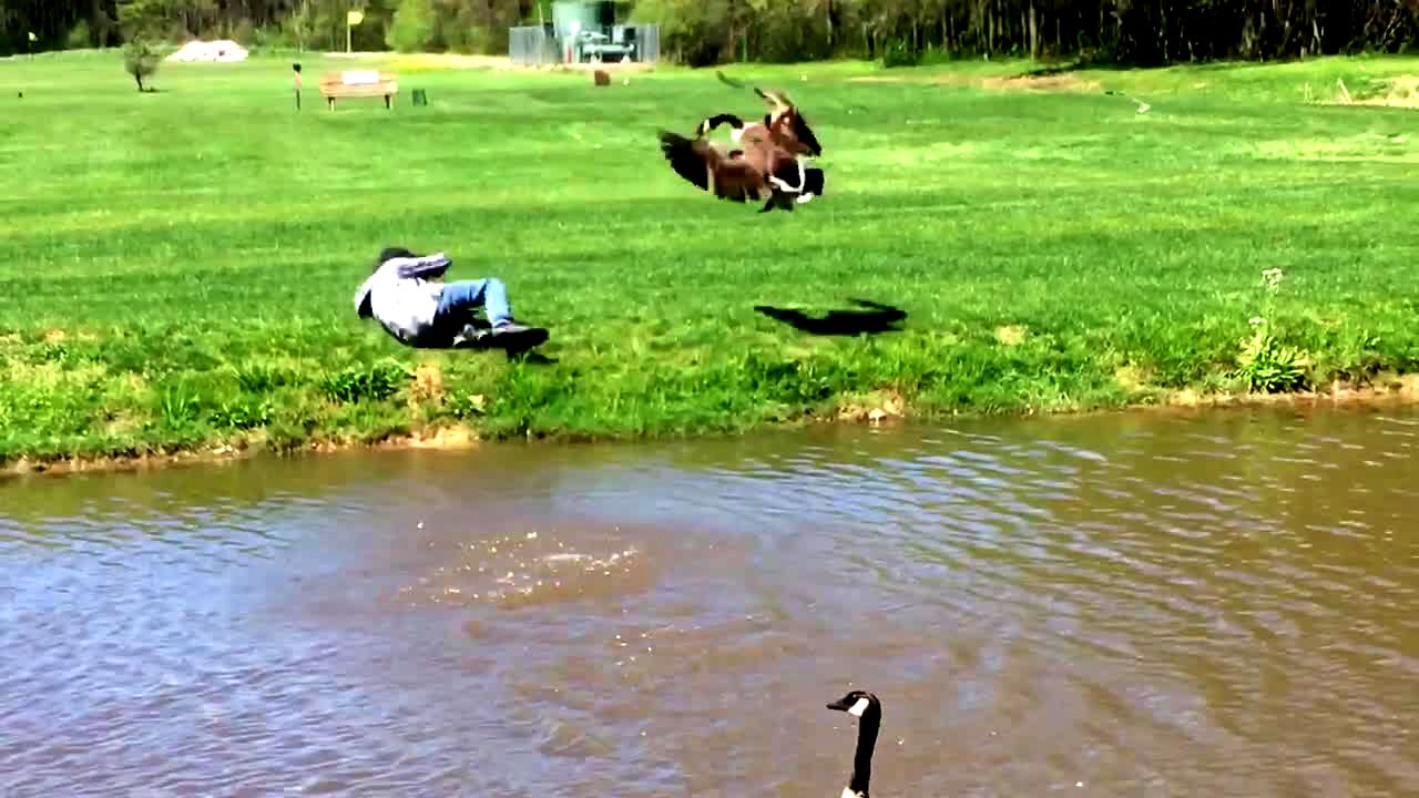 Boy runs from a goose who's chasing after him to attack. Mom tapes and laughs really hard. Geese, birds.