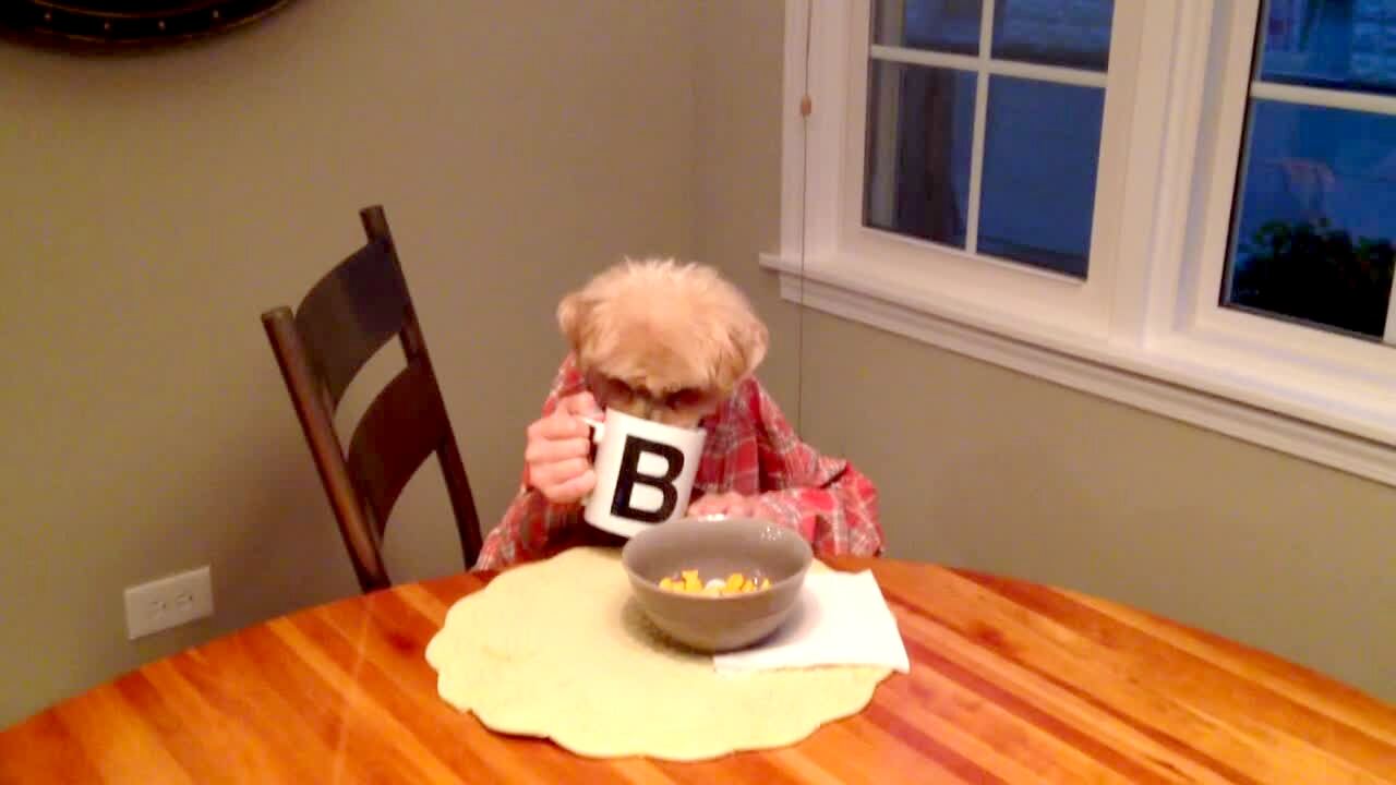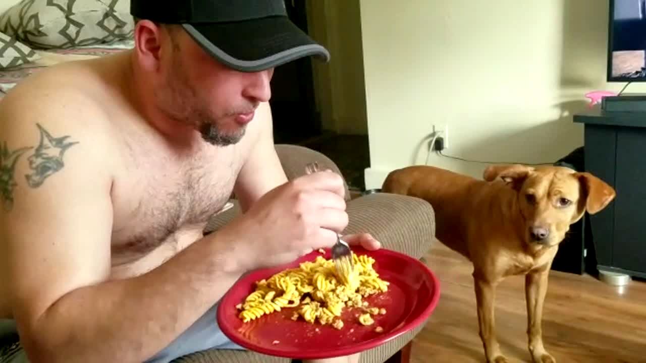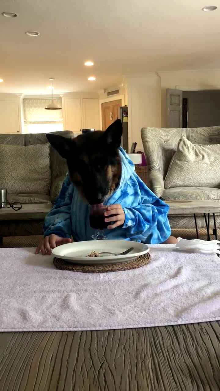 A dog with borrowed hands sits at the dining table in the living room and uses utensils to eat food off a plate.