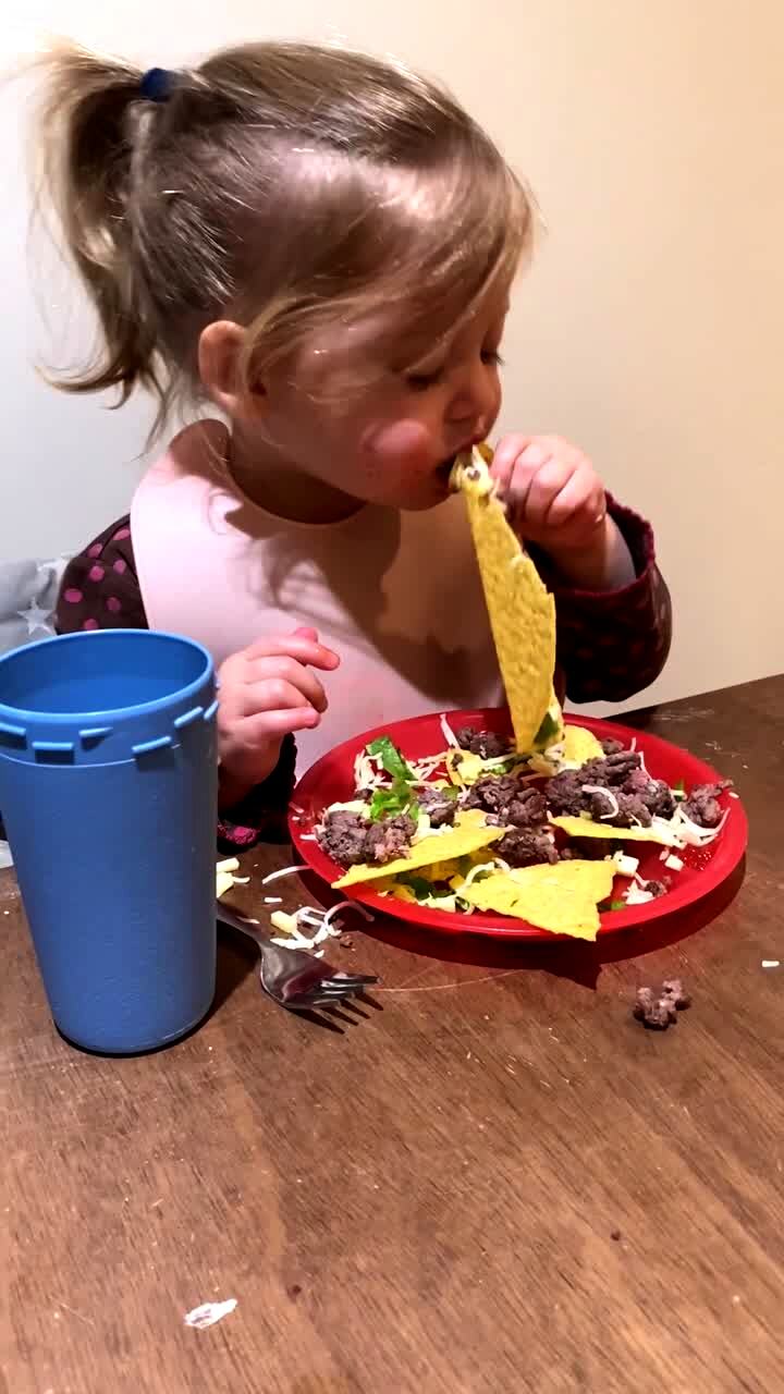A tot girl eats a hard-shelled taco in a kitchen before the entire thing falls to her plate.