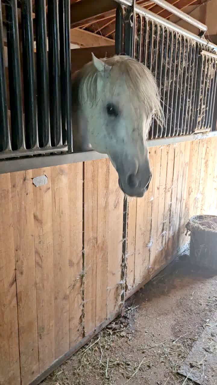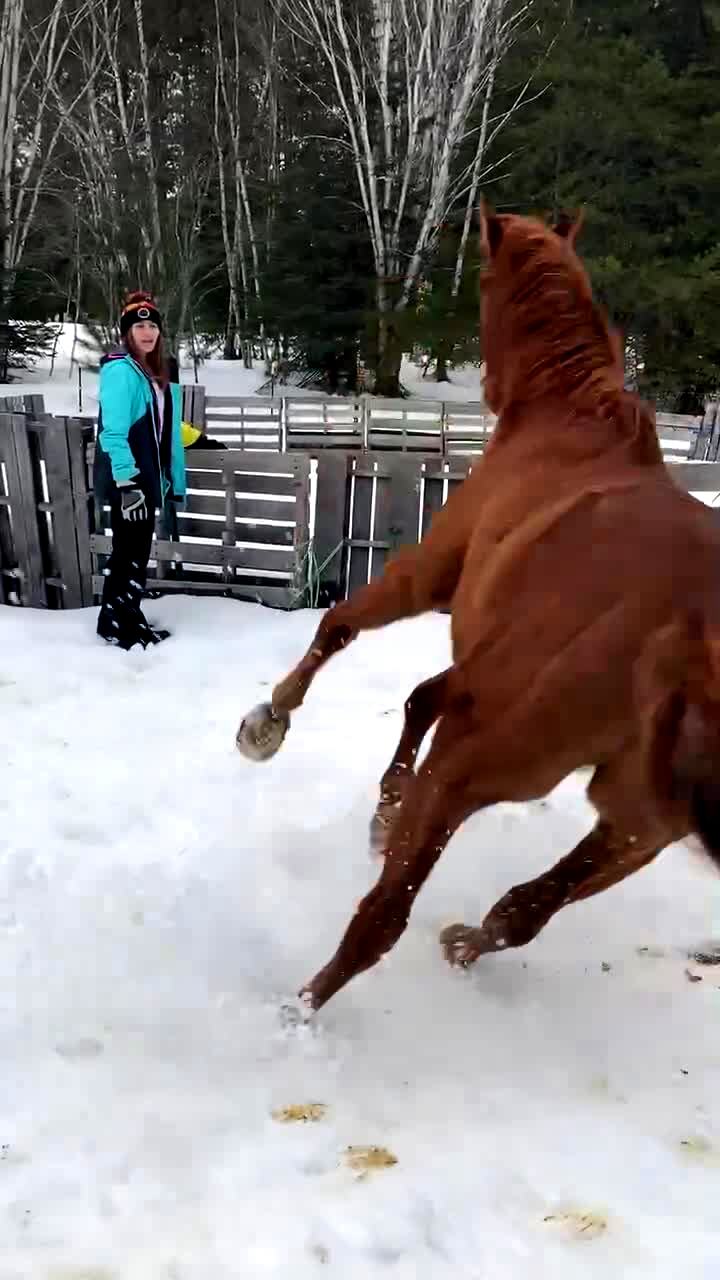 A horse runs through snow on a farm to get close to the woman behind the camera, then farts and runs away.