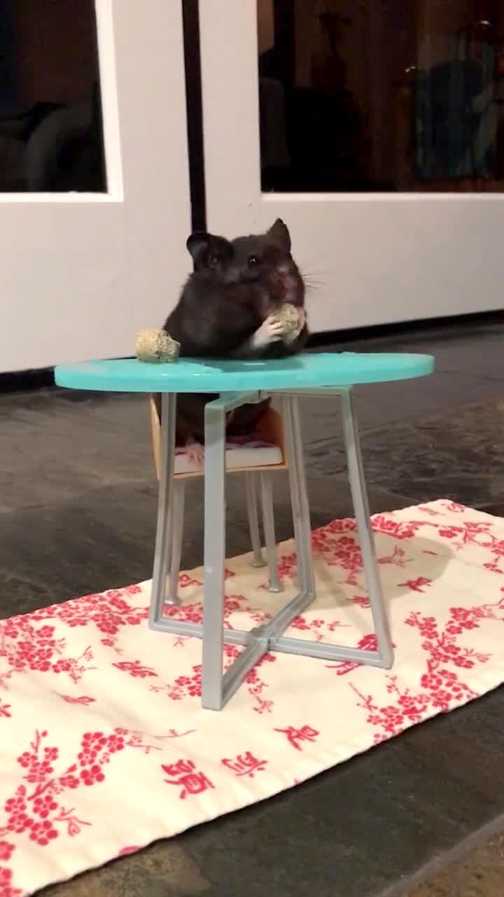 A hamster in a tiny chair at at tiny table in a living room shoves food into his cheeks and eats it.