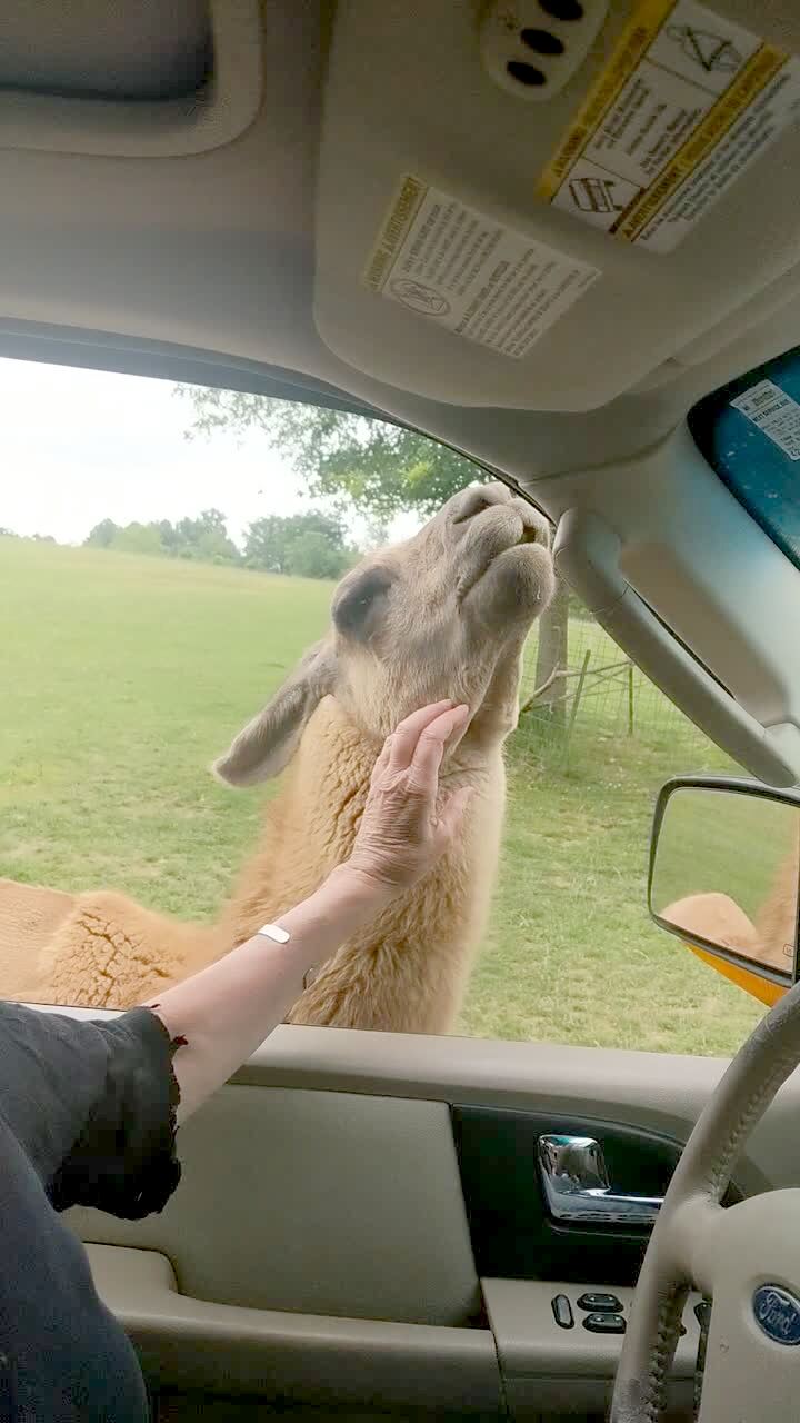 A llama chews on a woman's car as she goes through a drive-thru safari park. She pushes the llama out of the car, but it continues to chew on it until she drives away.