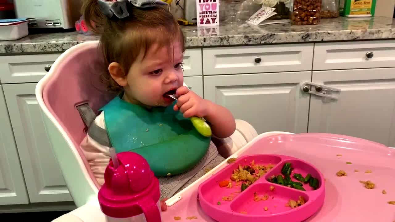 A woman tries to help her tot girl eat her food but the girl whines. The dad offers and the girl lets him and then smiles at the mom.