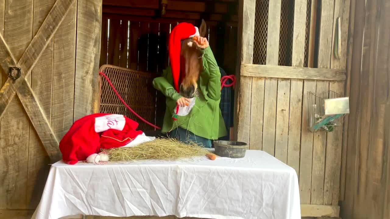 A horse in a Christmas costume eats hay and carrots with human hands at a stable.