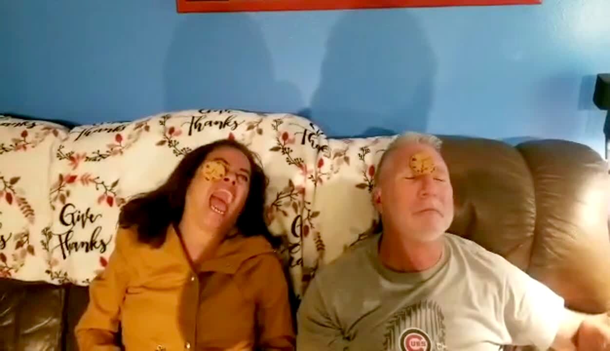 A man and woman wiggle their faces and the cookie falls into the woman's mouth and she cheers in the living room.