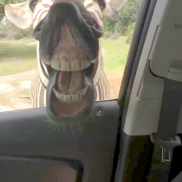 A family drive through a safari park and a zebra sticks its head in through the window and makes a funny face.