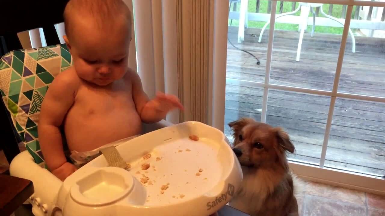 A baby girl sits and eats in a high chair in a kitchen and a dog sits below her and waves his paws and begs but the girl stares at him.