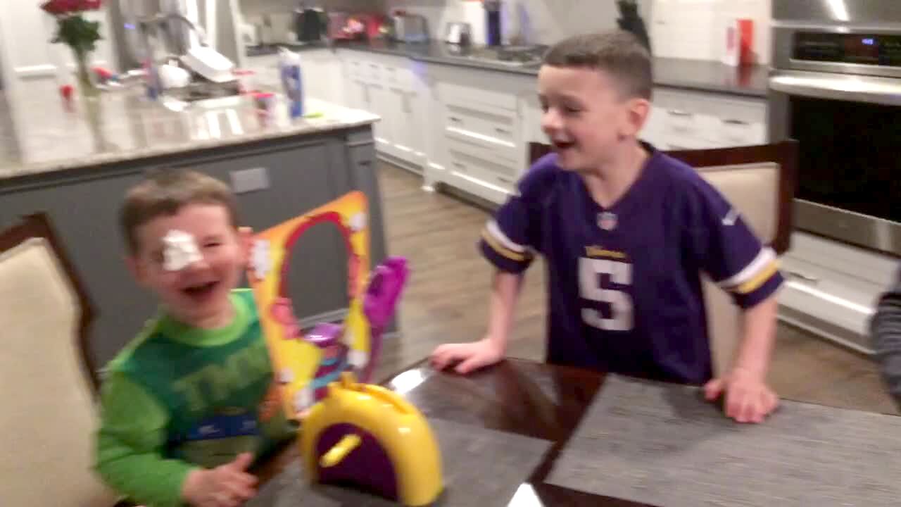 "Breakable Boy" Woman & tot boy sit in the living room surrounded by toys. Boy tells woman she can't play with his toys because they're breakable. Kids say.