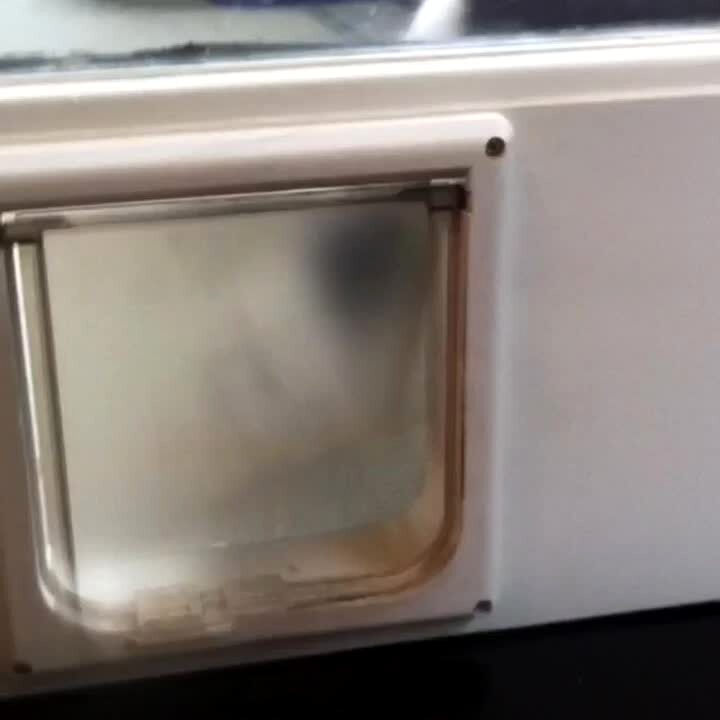 A black and white cat stands outdoors and repeatedly hits a cat door with its paw. The door swings open and closed.