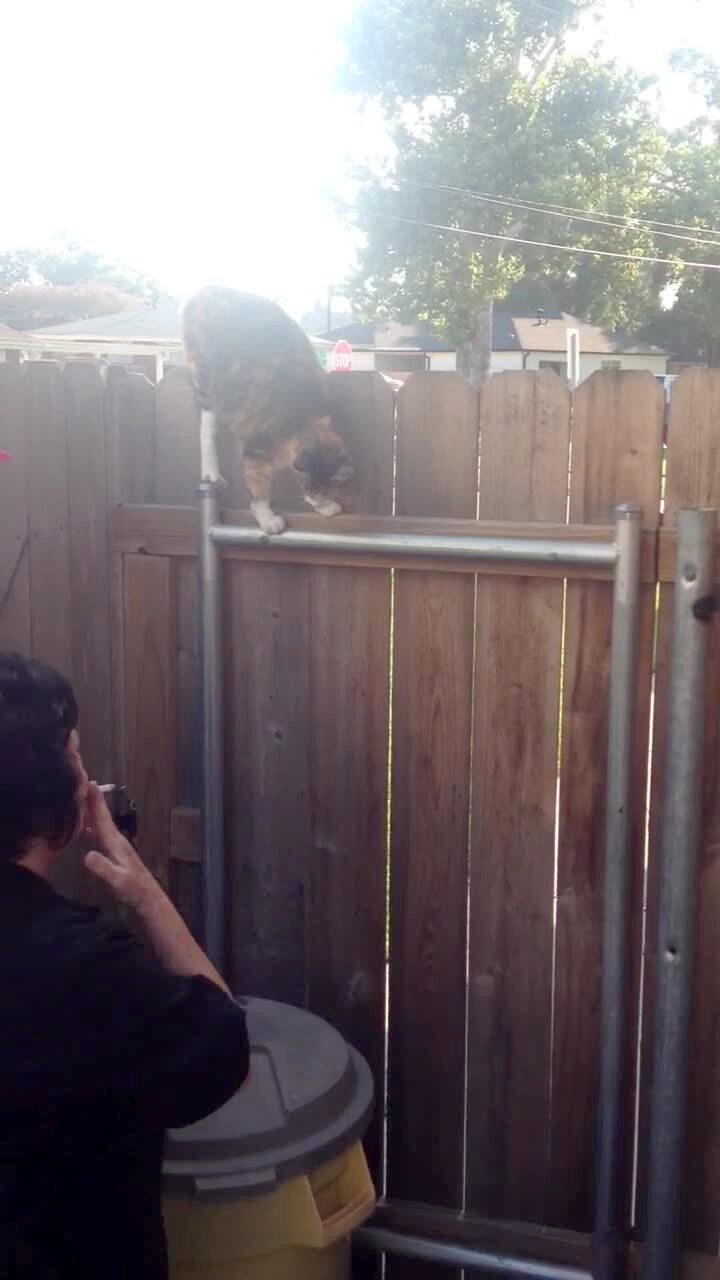 A bird slams into a cat repeatedly while the cat lays on a fence and lets its legs hang down.