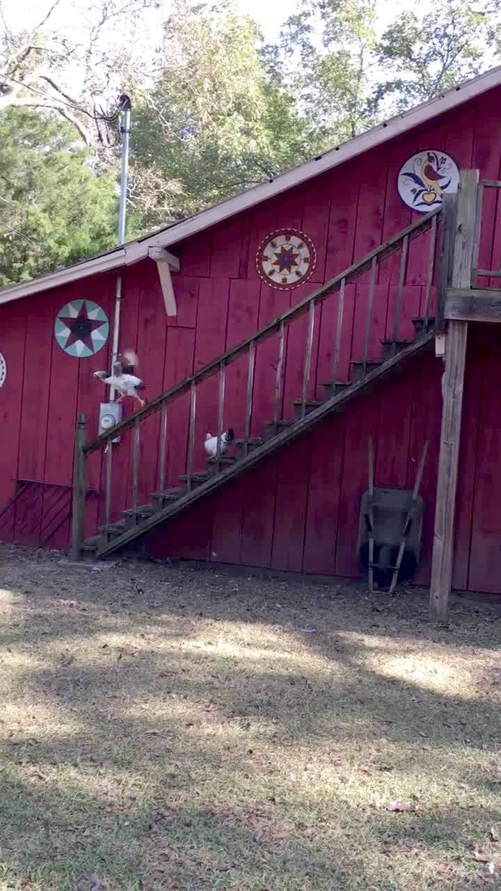 A cat balances on a stair railing and jumps on to curtains and the entire rod falls down in a house.