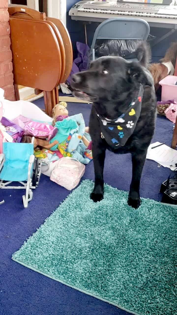 A woman says "I love you" to a dog in the living room and the dog whines and sounds like it says "I love you" back to her.