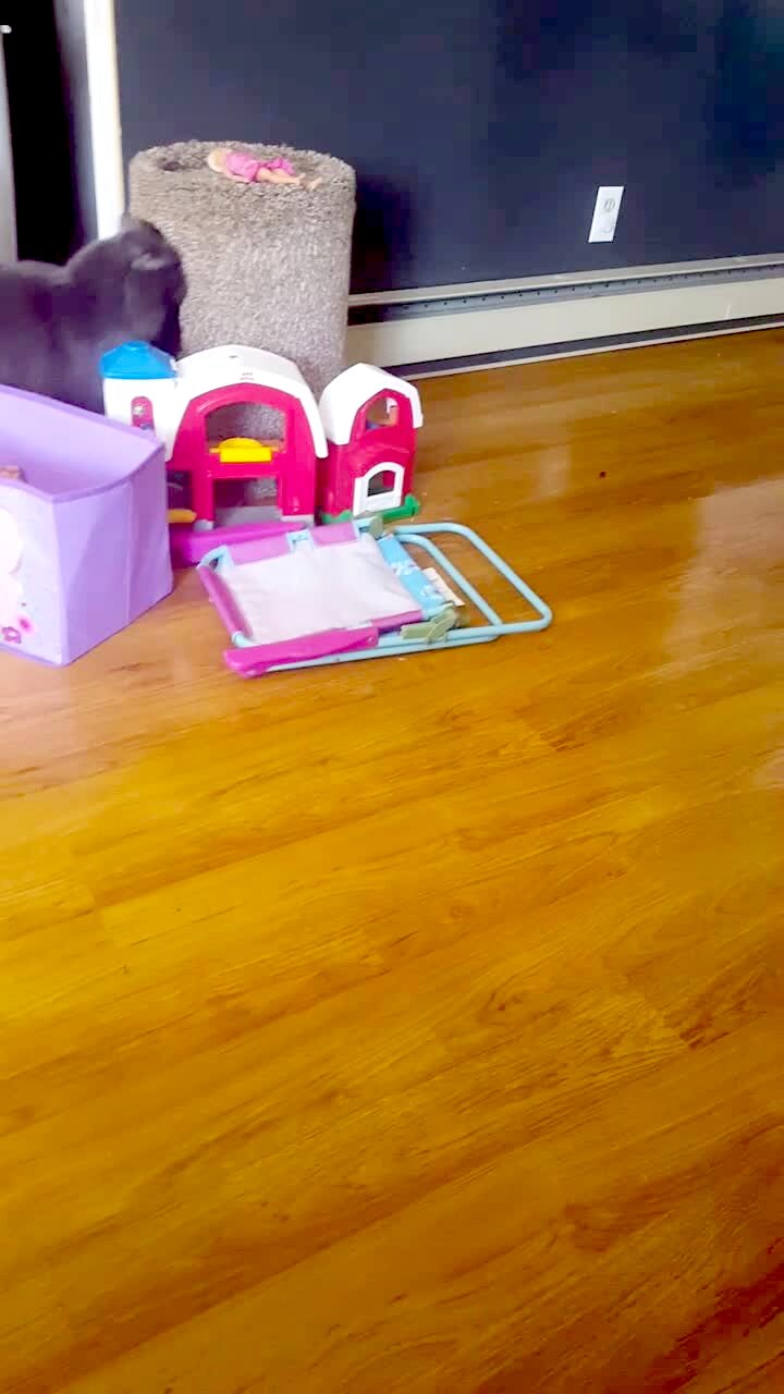 A young girl makes a shot in a toy basketball hoop. When she bends over to pick up the ball the goal falls over landing on her head.