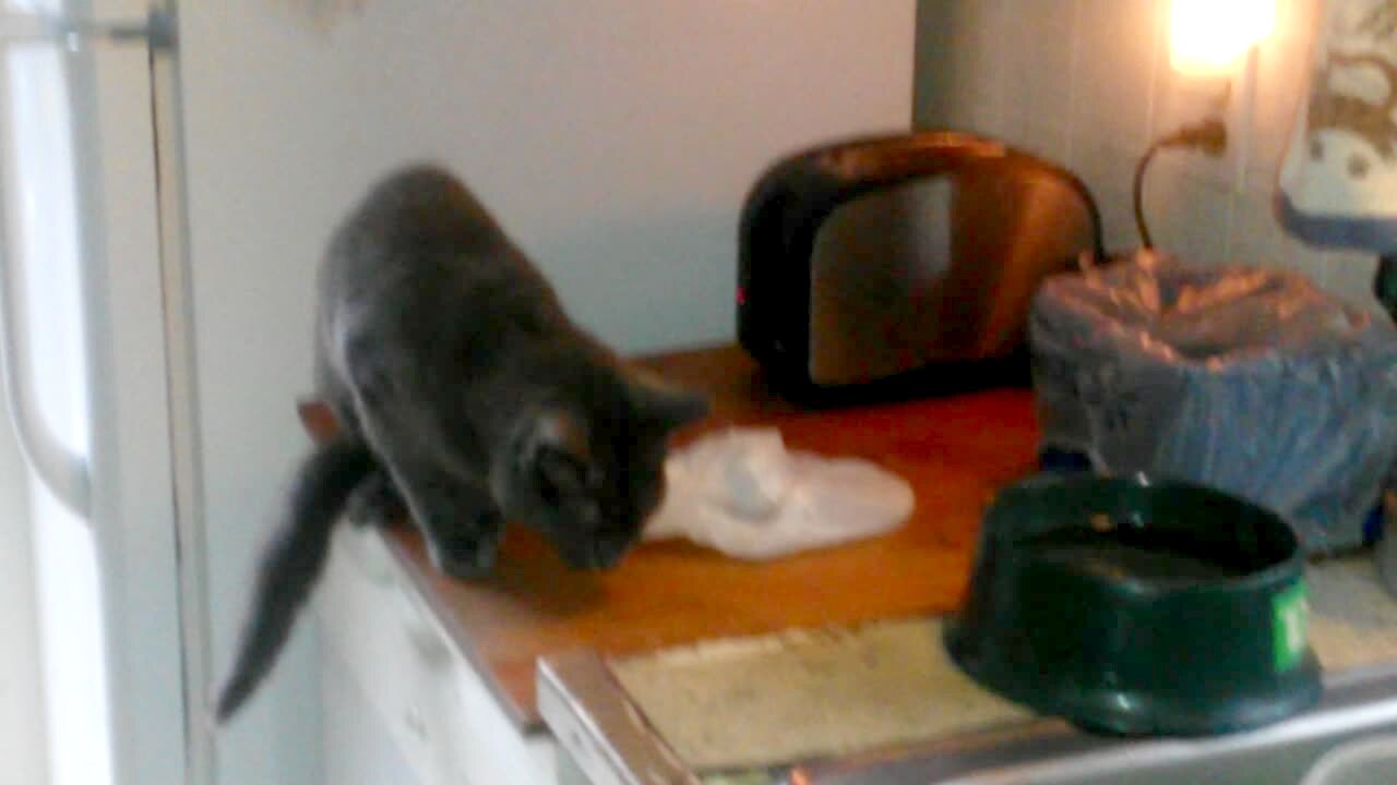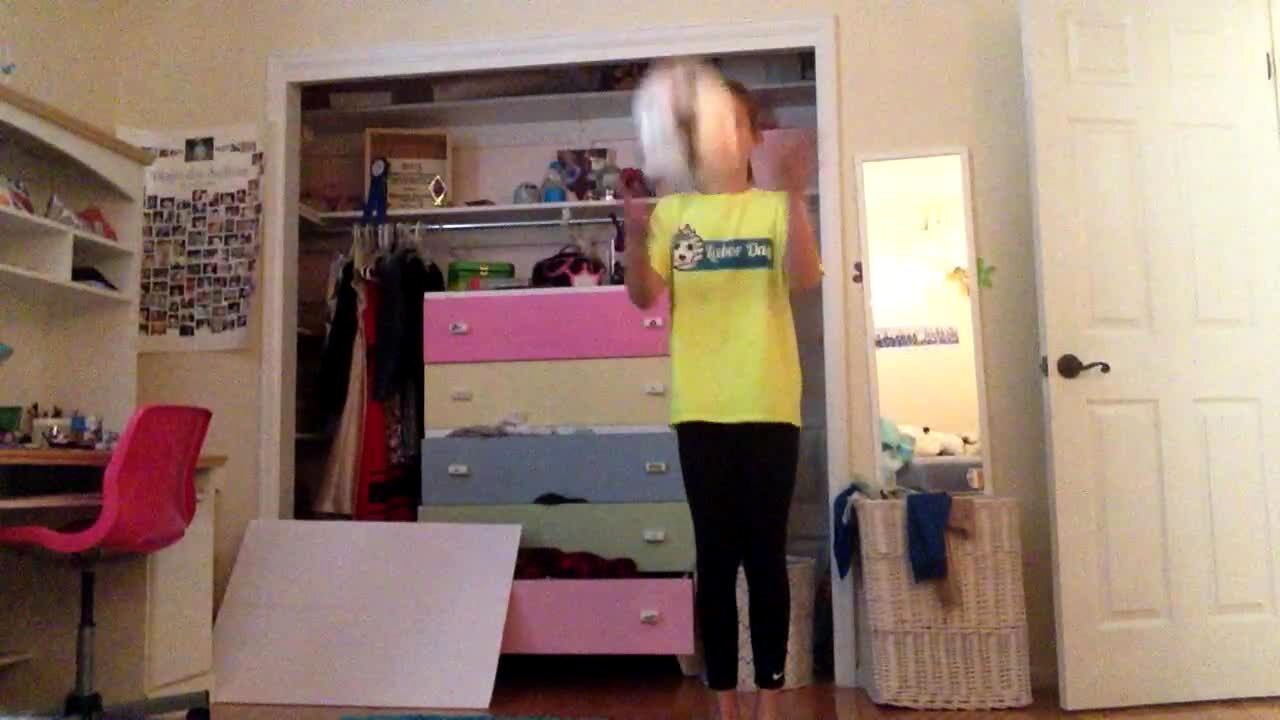 A young girl uses a volleyball to hit a billiard / pool ball in the air. The ball hits and breaks something behind the camera. The camera pans to reveal a broken toilet and pans back to the girl covering her mouth.