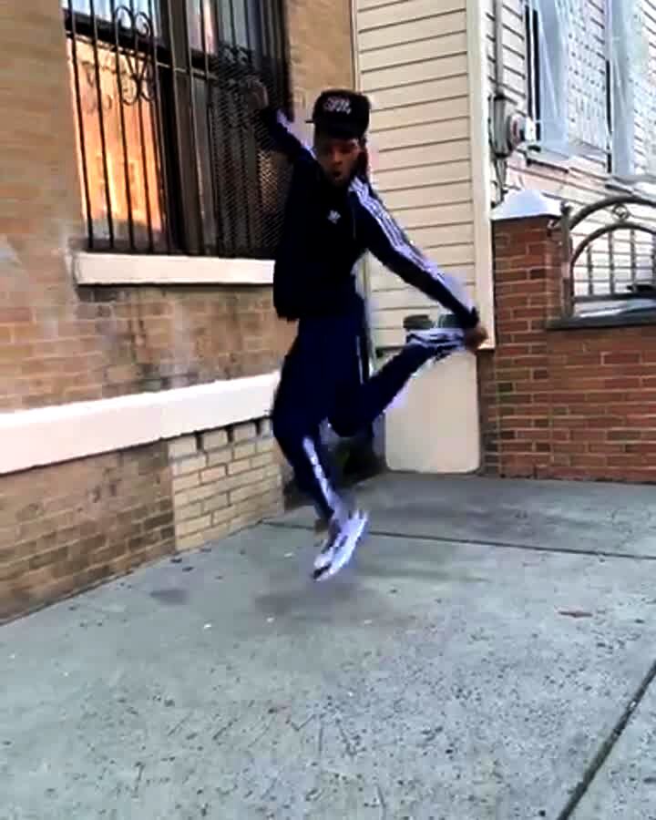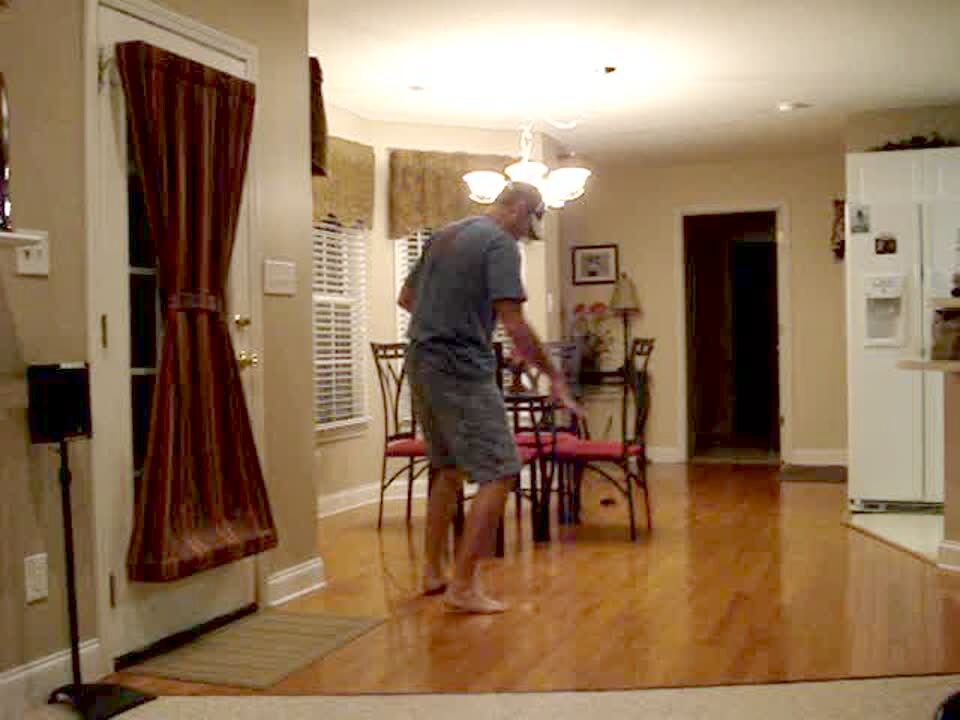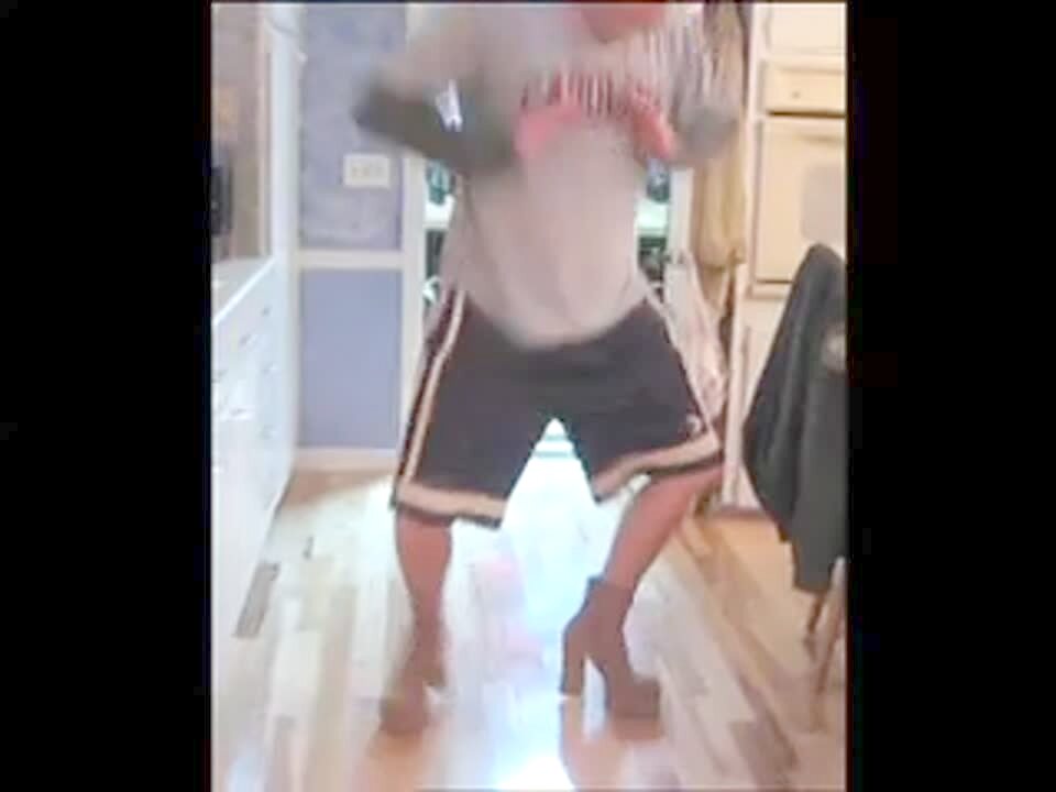 A teen girl dances with a scarf around her head. In the background a man stands on a step stool and gets hit by a moving ceiling fan. Music rights not cleared.