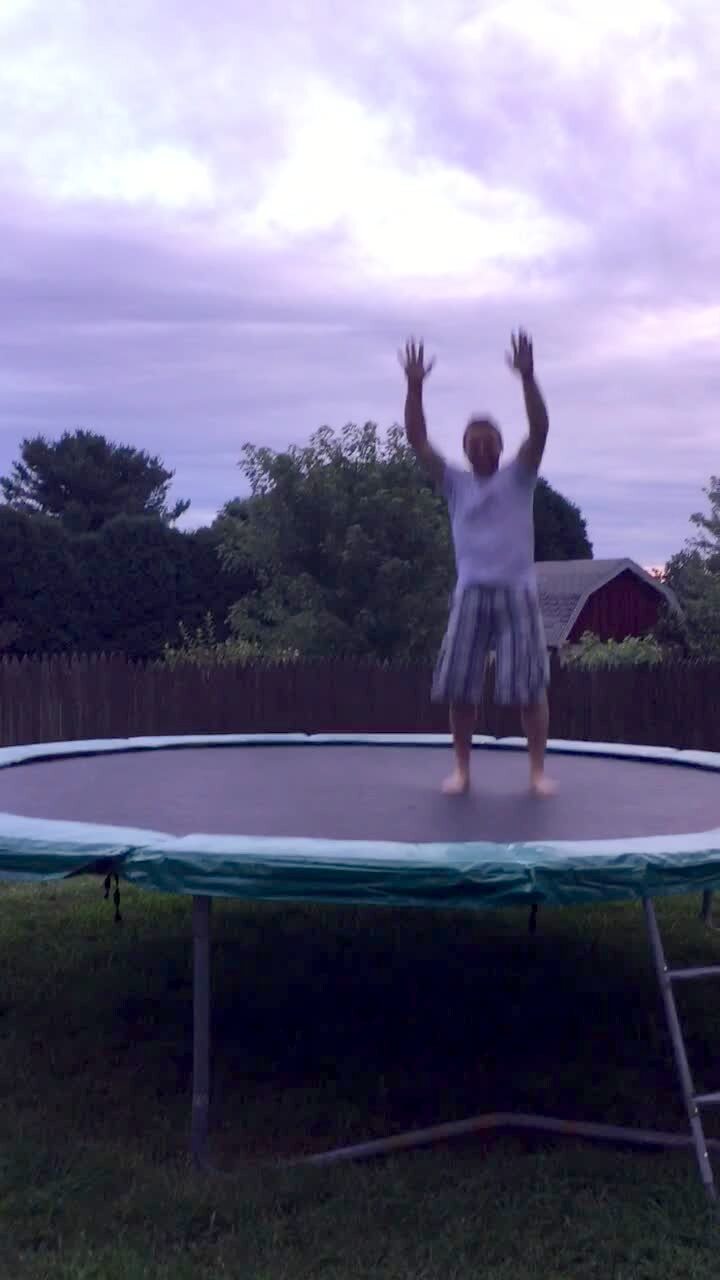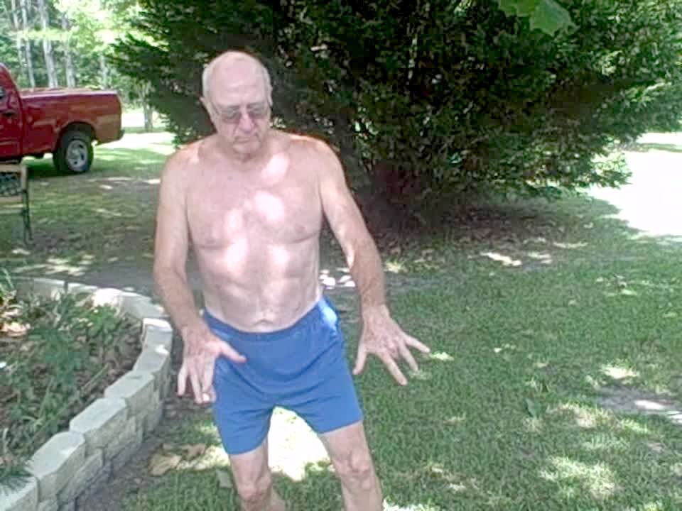 Senior man wearing only blue shorts dances some hip hop moves in the backyard.