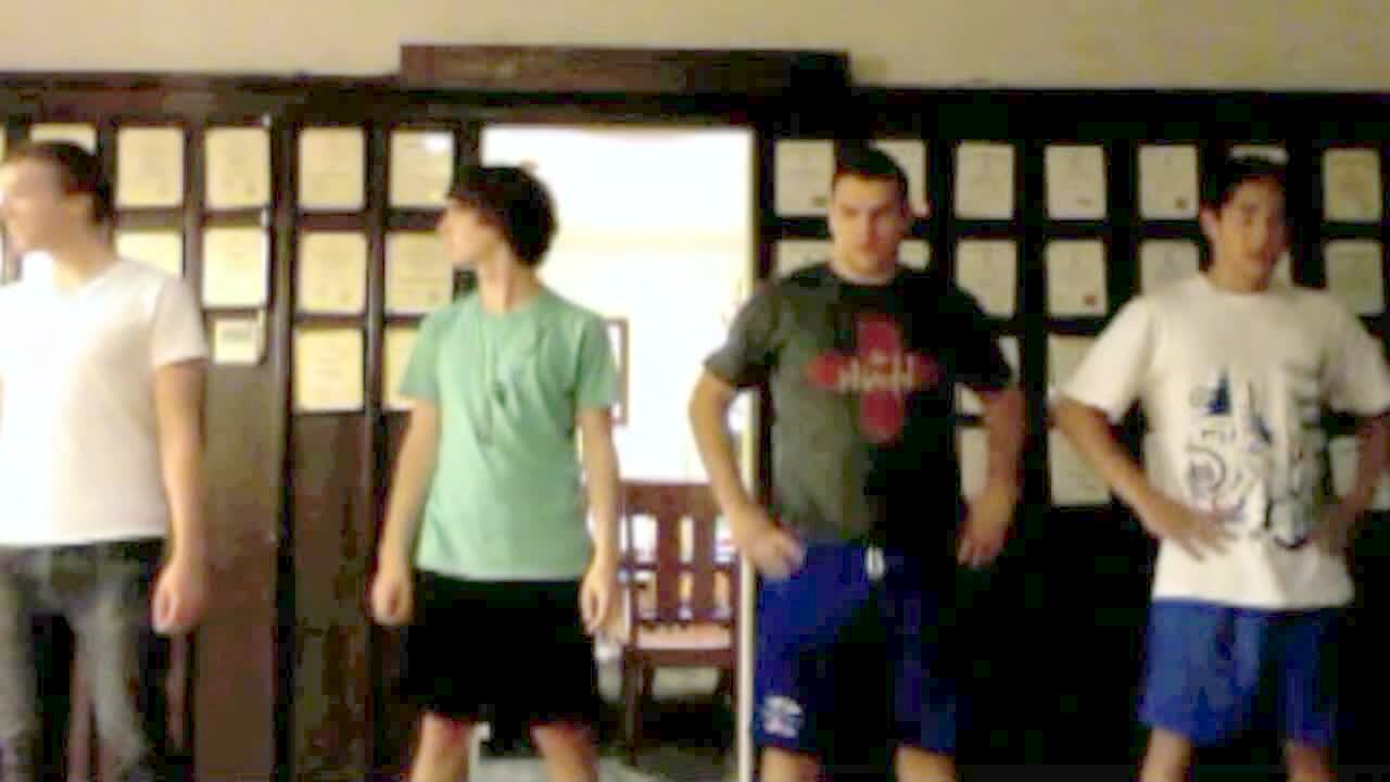 College men dance to Lady Gaga and one man falls hard off of another's shoulders. (2103)