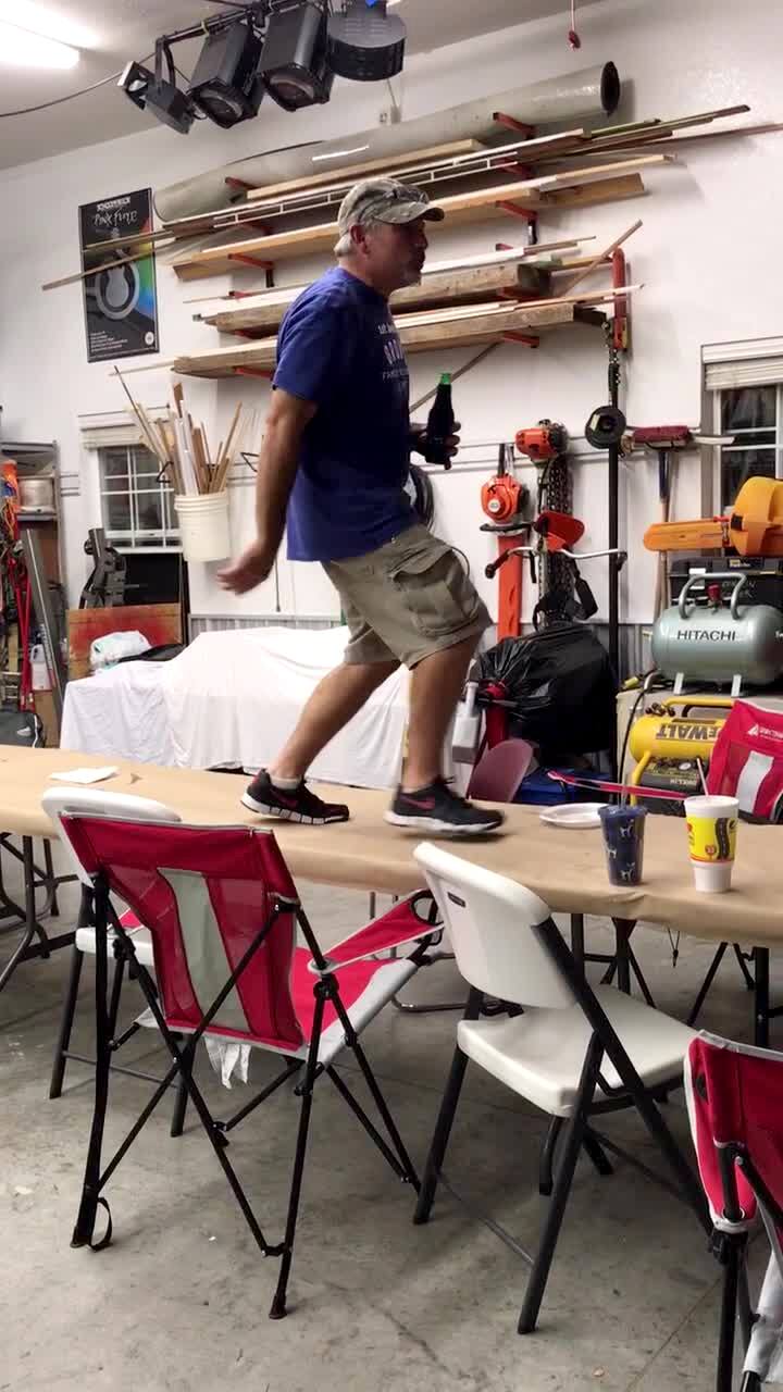 A senior man uses a power drill to make noises while he does the robot dance in the garage.