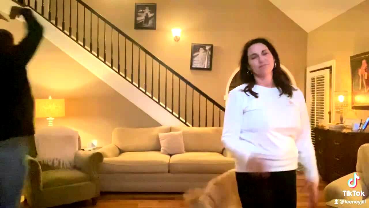 Adult woman impersonates "Dirty Dancing" scene with jump into adult man's arms which causes them both to fall.