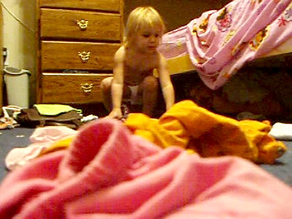 A woman questions her tot daughter in the bedroom after she made a mess with Vaseline jelly and rubbed it on herself and her doll. The camera turns to show that she also rubbed it on her sleeping dad's face and the girl continues to rub it on his face. Spanish audio.