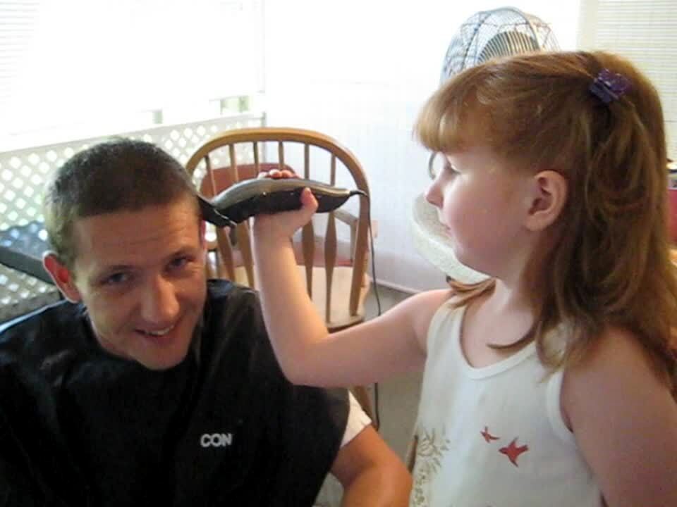 A girl shaving mans head with a razor. Man tells her to look at the camera. She does and then proceeds to fall off the chair she is on. No tails.
