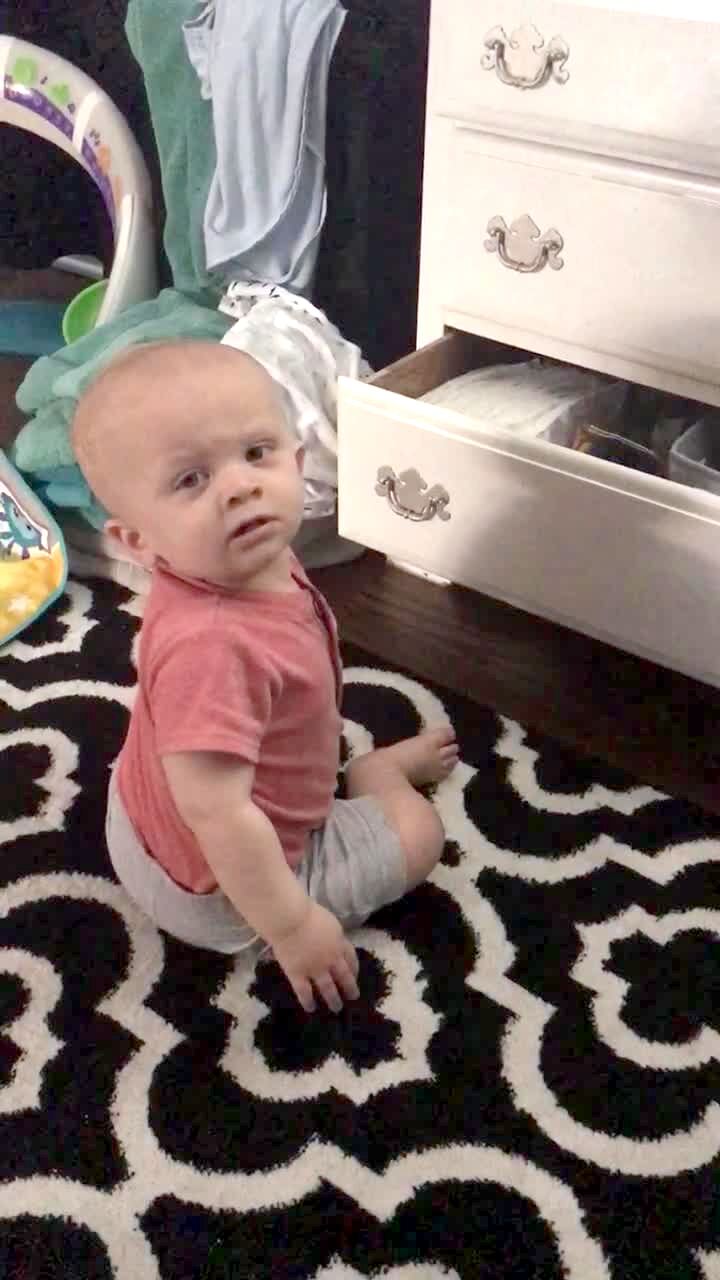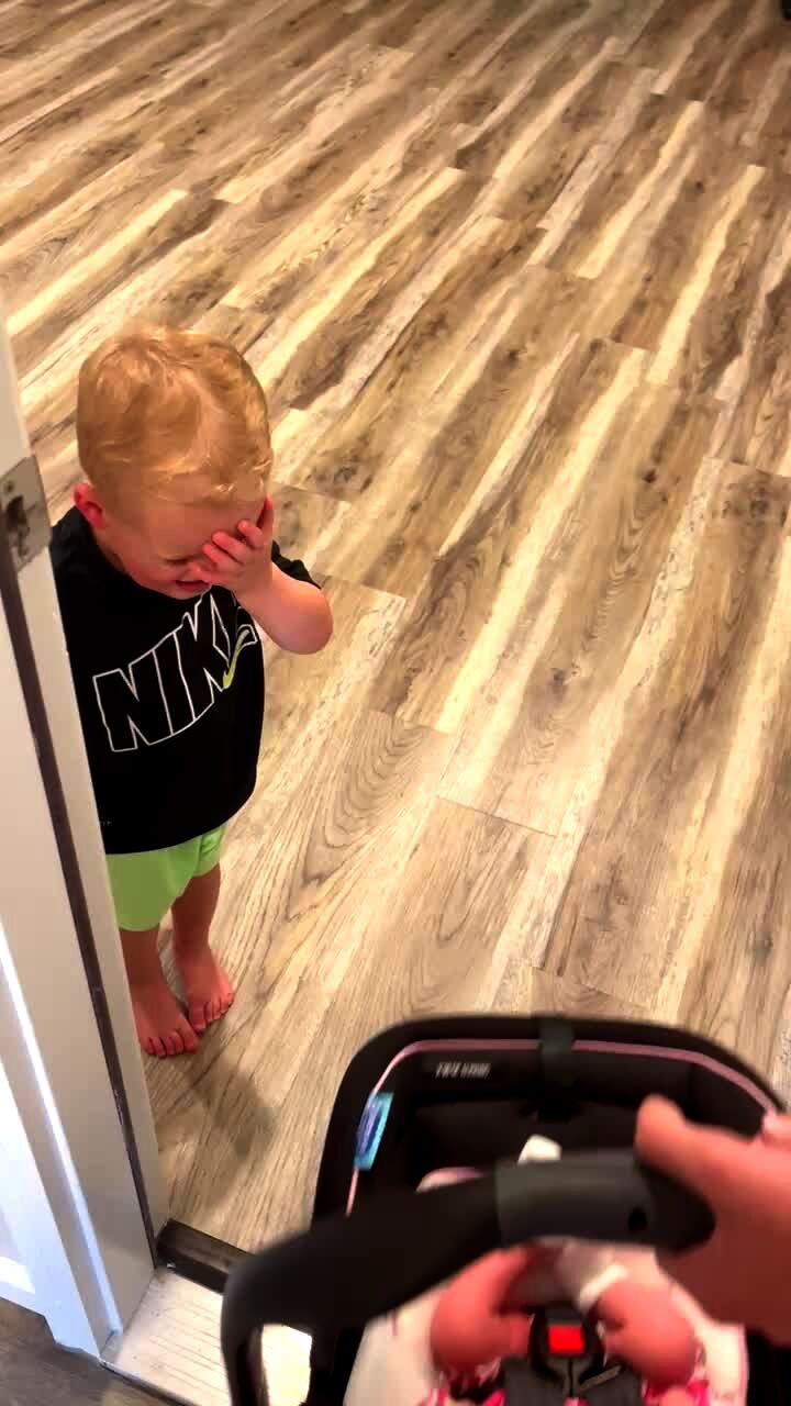 A man brings a baby home, and a tot boy opens the door and cries when he sees her.
