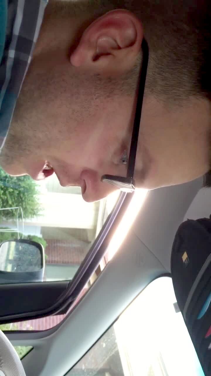 A man in a car lip syncs along to a young girl while she yells about her window in the backseat.
