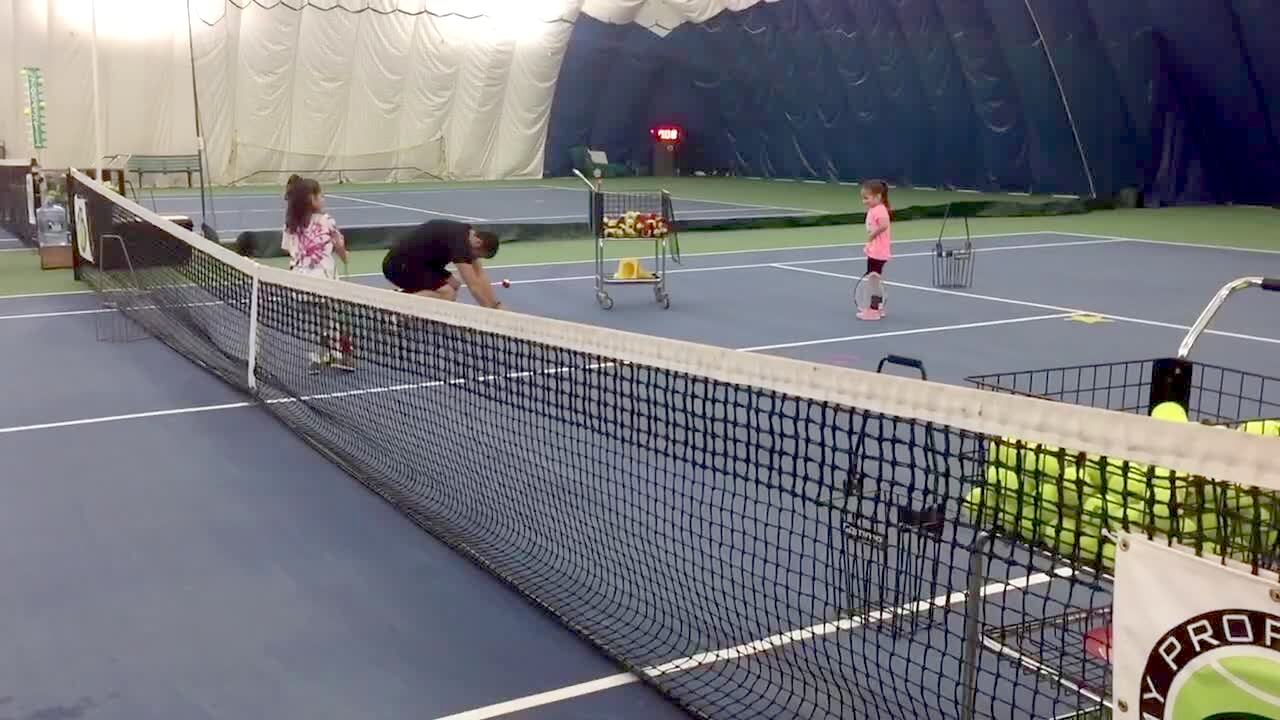 A man gives a tot girl a tennis lesson and she hits him in the groin.