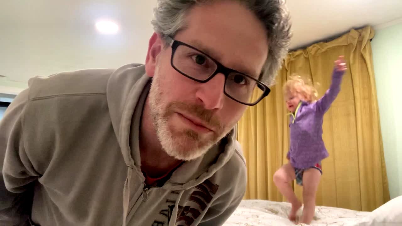 A man in a bedroom throws a young girl onto the bed. The dad says, "No more monkeys jumping on the bed!" However while he's distracted talking to the camera his daughter stumbles and falls off the bed and begins to cry.
