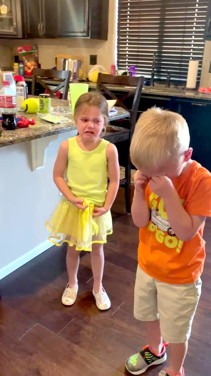 A young boy and girl cry and complain that "dad picked up all the poop and now there's nothing for us to pick up!"