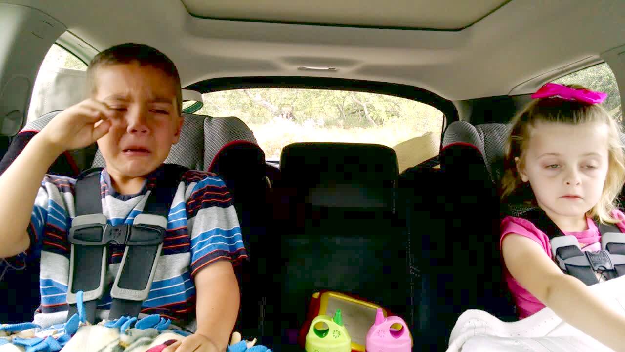 A young boy cries in the car when his father tells him they're on their way to Disneyland and not his grandmother's house.