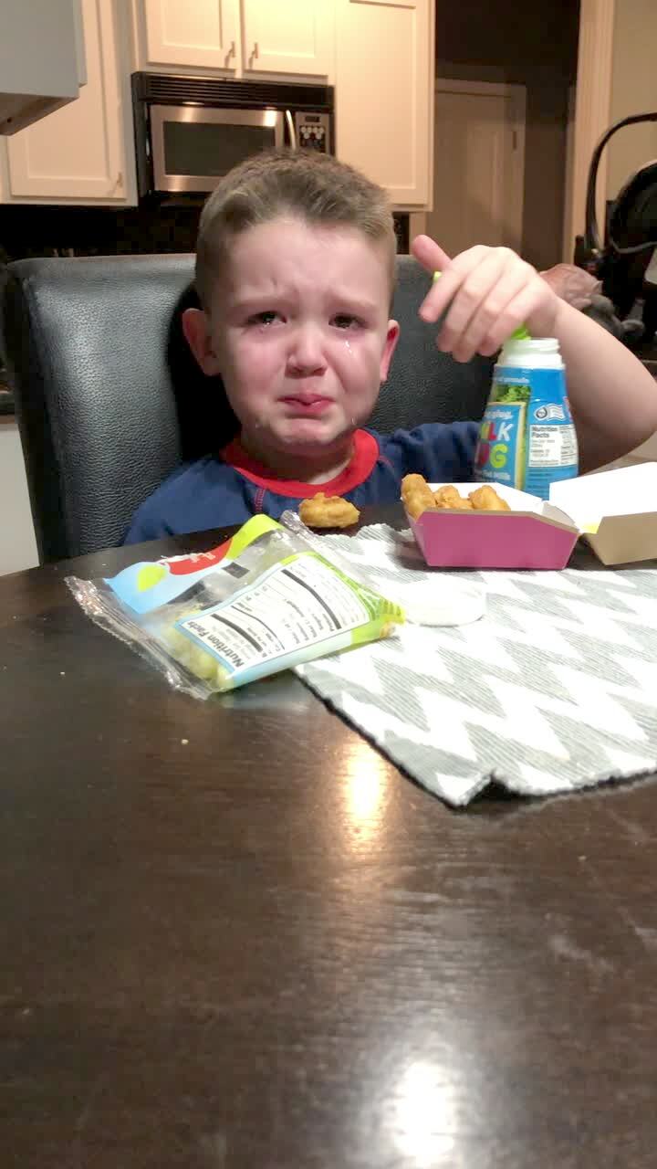 A tot boy sits at a dinner table and cries because he "hasn't found a wife". His mom asks if he wants help to find a wife and he says yes.