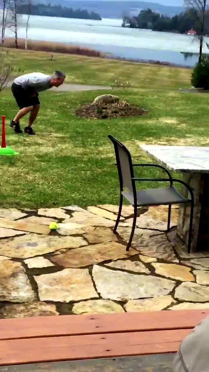 A woman beckons a Rottweiler dog on a hammock, it jumps on then flips the hammock, and she falls flat on the ground.