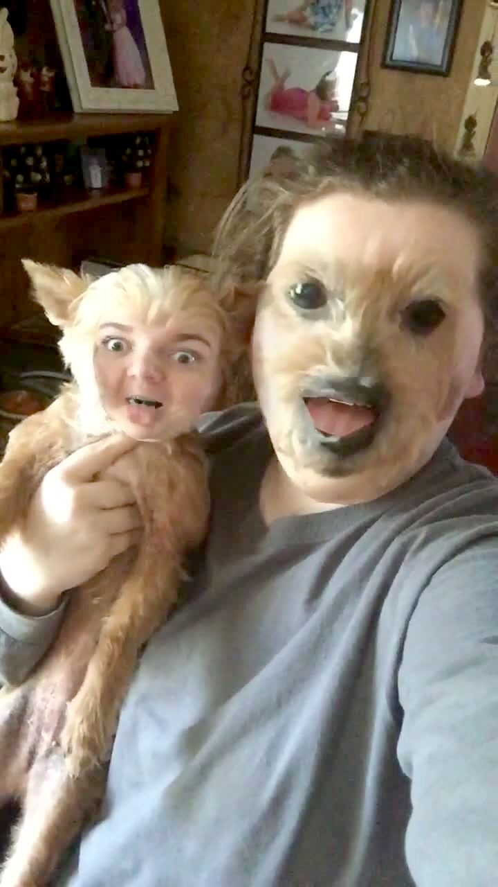 While it's tongue hangs out, a dog repeats, "Lala," with a woman as they sit on a living room couch.