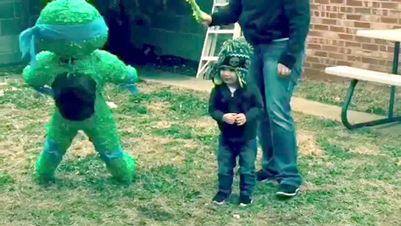 A shovel flies out of a young boy's hands and over his shoulder as he uses it to clear snow off the patio.