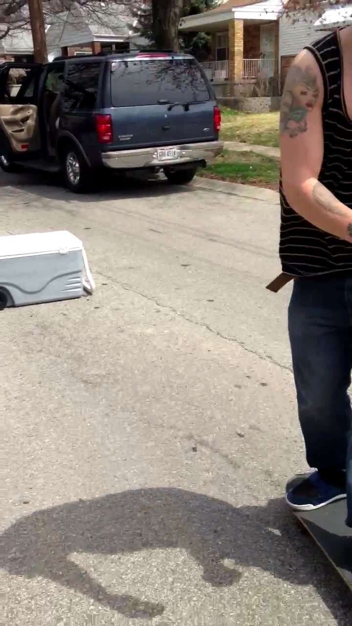 "Skater Imitator" A teen boy skateboards down a street and jumps over a cooler on the ground. His tot brother runs after him with a skateboard in his arms, throws it over the cooler and jumps over it as well as he skateboards to catch up with his brother.
