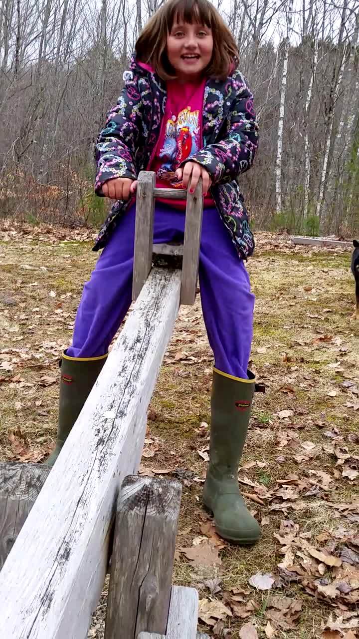 A girl rides a see saw with large boots and her legs look strangely long as they slip out of her shoes.