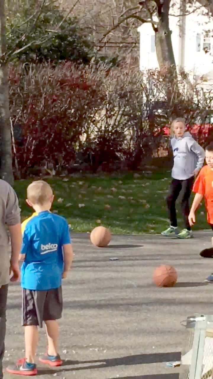 A group of kids do a series of jumps and slides into a pool keeping a ball mid air and then the last one gets it in the basket. A kid runs up to the camera screaming, 'how did that happen?'