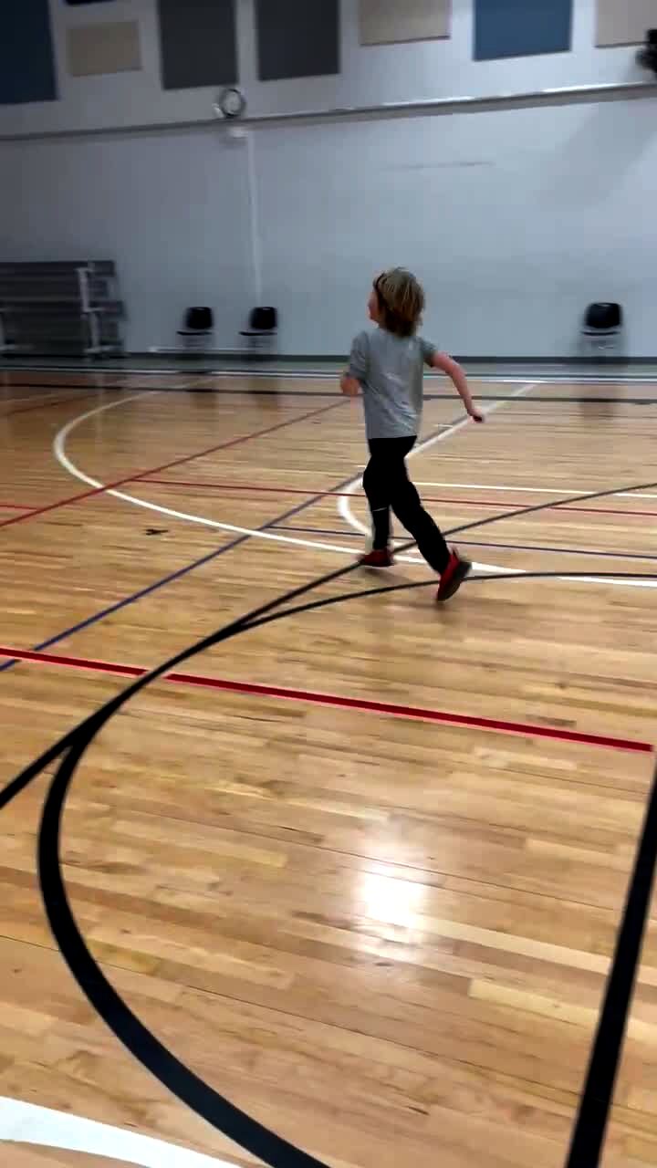 A young boy punts a soccer ball from the half court line of a basketball court and makes the ball into the basket and runs around the gym to celebrate.