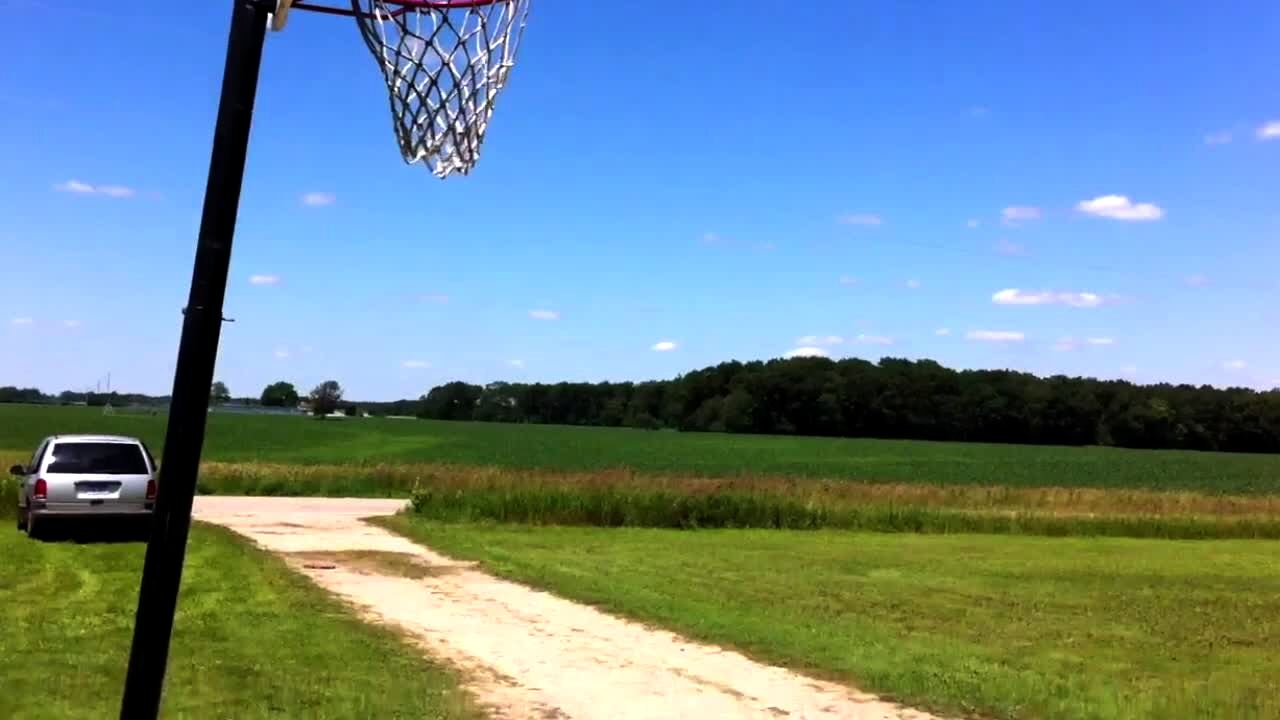 A group of teen boys do a basketball trick shot where one boy throws it across the yard to other boys at a pool who catch it and pass it to each other and the last boy shoots it into the hoop in slow motion.