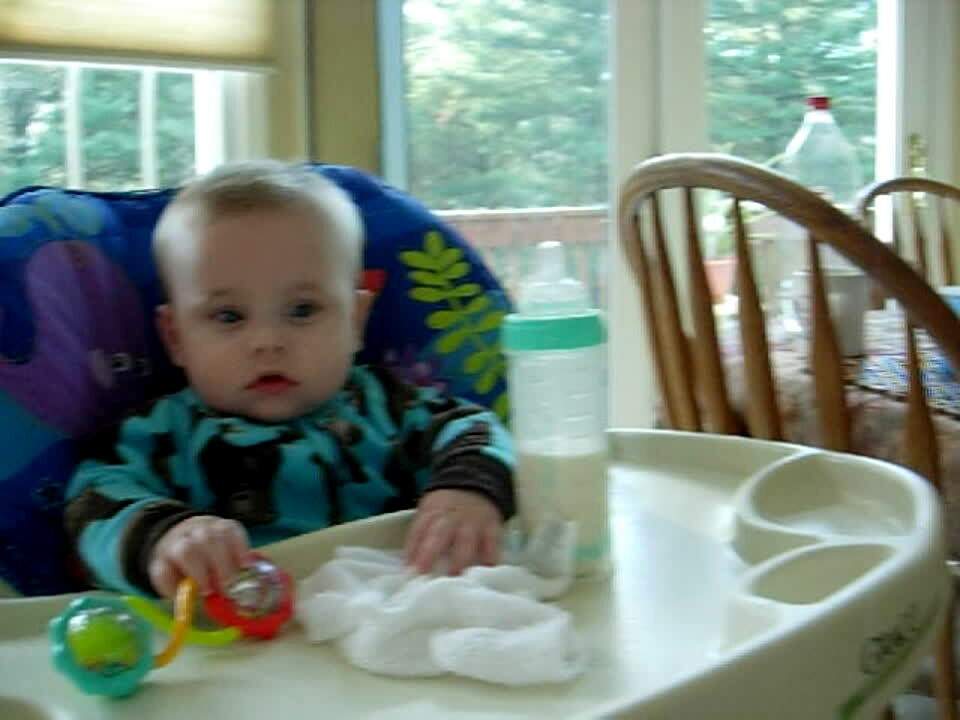A boxer dog repeatedly says "Mama" after a woman asks her baby grandson to say "Mama" as he sits in a high chair in the kitchen.