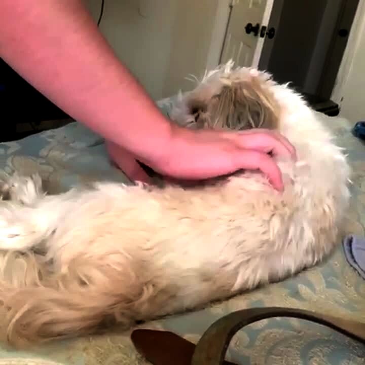A woman talks, then music plays until she exposes a dog under the covers in the bedroom.