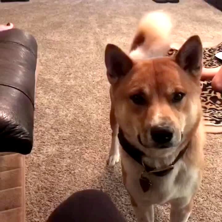 A woman says "dinner" to a puppy dog and he jumps up and stares at her excitedly.