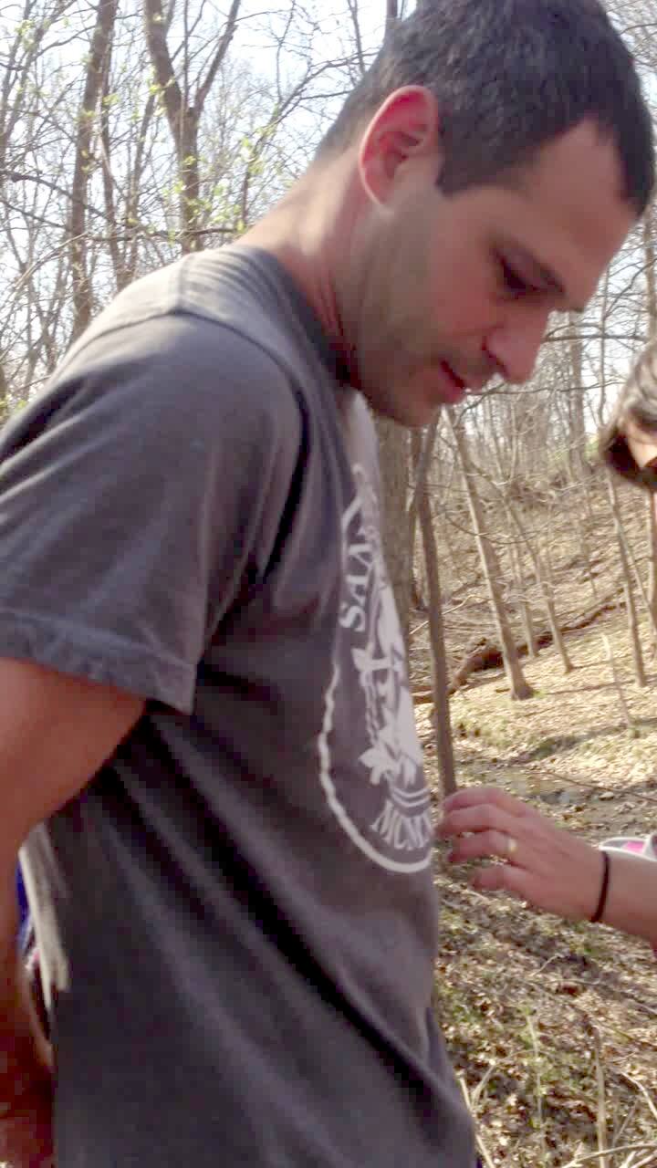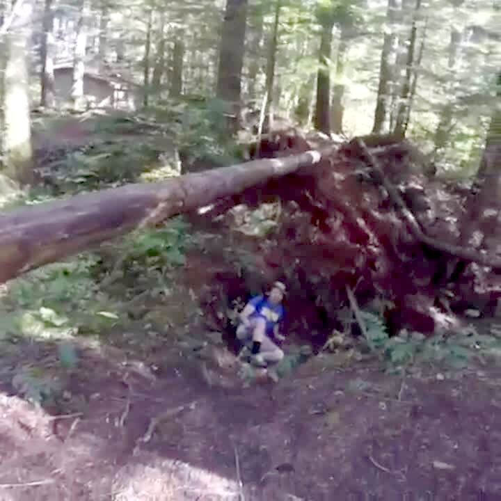 A man walks across a log over a ditch outdoors when he falls with the log between his legs and falls further into the ditch. Vine/instagram