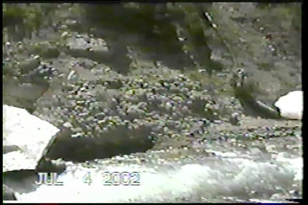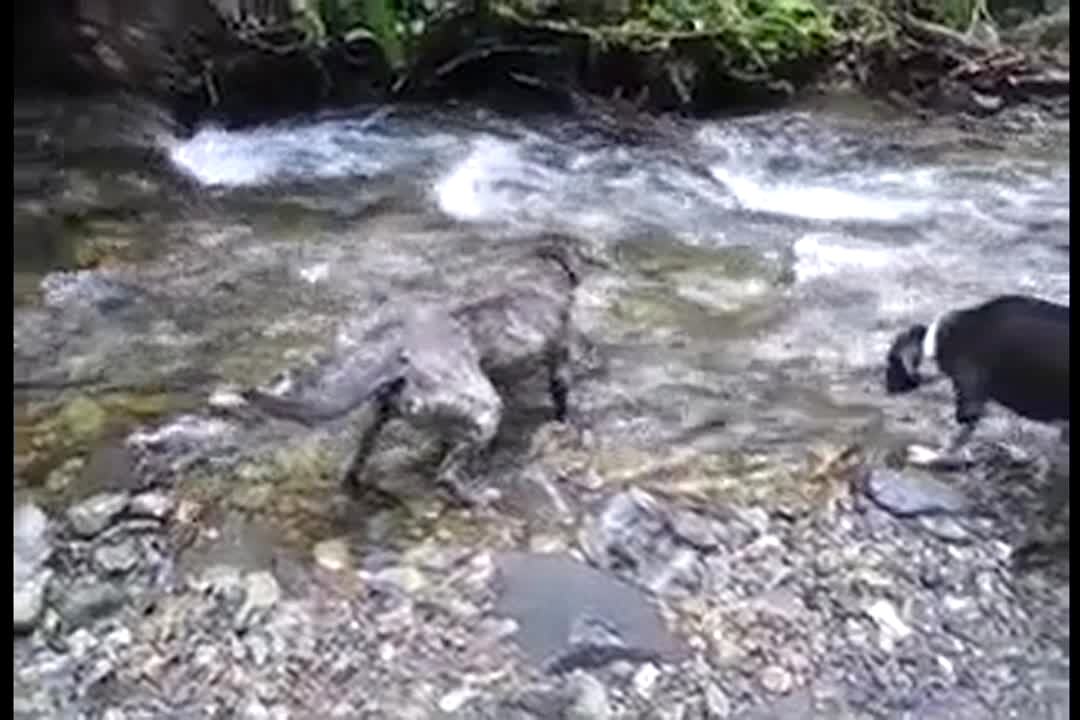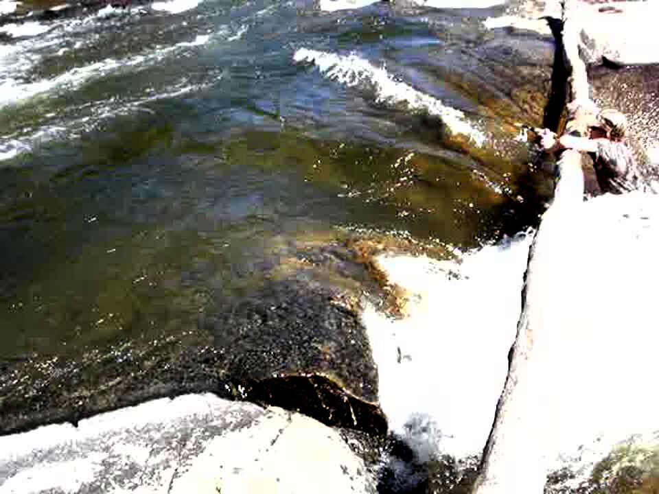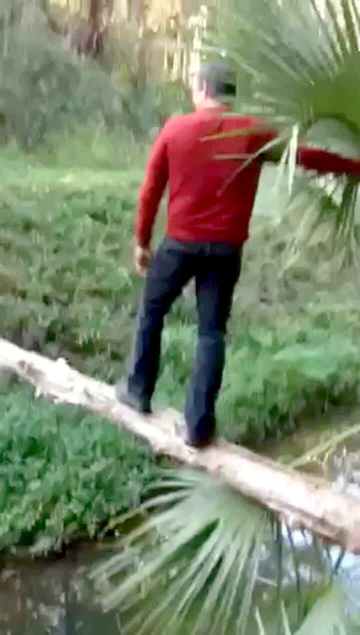 Man tries to walk on a log to cross a river. Slips and falls and hits groin on the log before falling in the water.